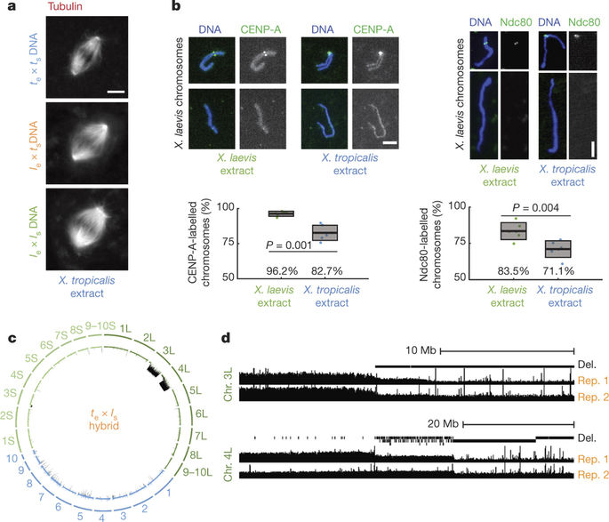 Figure 2. a, Fluorescence images of spindles formed around X. tropicalis, le × ts hybrid, and X. laevis chromosomes in X. tropicalis egg extract. Scale bar, 10 μm. Quantification for n = 147, 103, and 156 spindles quantified for X. tropicalis, le × ts hybrids, and X. laevis embryo nuclei, respectively, from three different egg extracts, is presented in Extended Data Fig. 1e. b, Fluorescence images of X. laevis chromosomes stained for CENP-A or Ndc80 following replication in X. laevis or X. tropicalis egg extract. CENP-A and Ndc80 labelling was quantified from six experiments (three biological replicates in two technical replicates), a total of n = 1,792 and n = 1,959 chromosomes, respectively, in X. laevis extract, and n = 2,692 and n = 1,930, respectively, in X. tropicalis extract. Scale bars, 5 μm. Box plots show the six experiment percentages as individual data points, their average as thick lines, and 1 s.d. as grey boxes. Ninety-five per cent confidence intervals are 96.2 ± 1.9% in X. laevis extract compared with 82.7 ± 5.7% in X. tropicalis extract for CENP-A, and 83.5 ± 6.1% compared with 71.1 ± 6.0% for Ndc80. P values were determined by two-tailed heteroscedastic t-test. c, Circle plot of whole-genome sequencing data for te × ls hybrid embryos aligned and normalized to the genomes of X. tropicalis (blue) and X. laevis (green), with underrepresented genome regions in black. d, Expanded view of chromosome (Chr.) 3L and 4L breakpoints with deleted regions (Del.) indicated in two biological replicates (Rep.). |