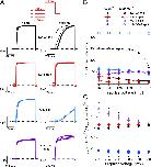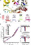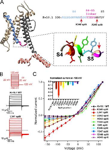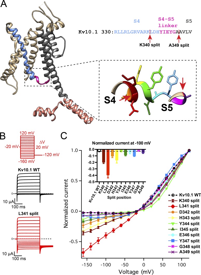 Figure 1. Constitutive activity of channels split within S4. (A) Lateral view of a KV10.1 subunit (PDB code 5K7L). The S4 helix is indicated in light blue, the S4âS5 linker in pink, the PD helices in gray, and the C linker in salmon. (Top right) KV10.1 sequence in the S4 helix and in the S4âS5 linker. We generated a series of split channels by disconnecting the VSD from the PD after every residue between the positions shown by red arrows. (Inset) The C-terminal S4 helix and the S4âS5 linker colored in a way corresponding with data points in C. (B) Representative, macroscopic currents of the wild-type channel and L341 split recorded without leak subtraction. (C) Normalized, mean current-voltage curves of the wild-type and several split channels (n = 6â14). Error bars denote SEM. (Inset) Normalized current at â100 mV plotted against the split position (mean ± SEM); dashed line shows the current level in the wild type. |