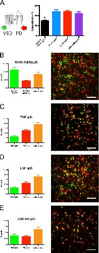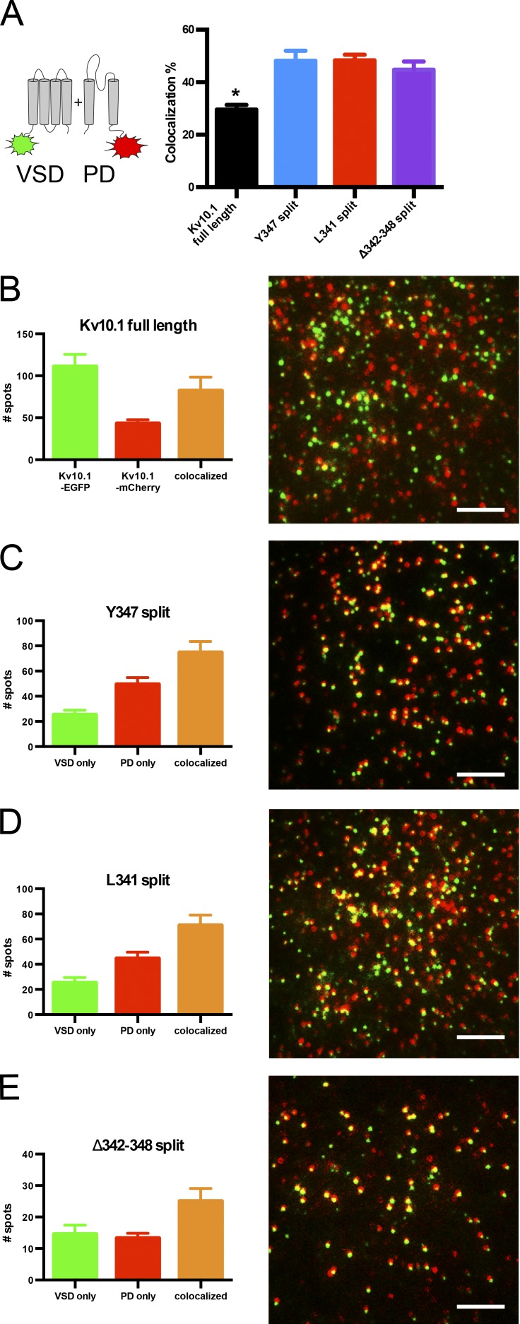 Figure 4. Single-molecule colocalization between fluorescently tagged VSD and PD. (A) Mean colocalization coefficients ± SEM, after subtraction of random colocalization (n = 8–14); asterisk indicates statistical significance (P < 0.05 in t test with Bonferroni correction) with respect to the wild-type channel. Tagged full-length subunits were used as positive control. (B–E) Representative 13 × 13–µm images for each condition and mean numbers of fluorescent spots per image ± SEM. Bars, 2.5 µm. |
