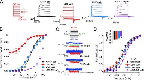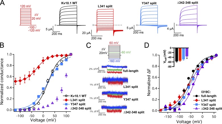 Figure 5. Voltage dependency of conductance and VSD activation in specific split channels. (A) Representative currents of the wild-type, L341 split, Y347 split, and Δ342–348 split recorded with the indicated voltage protocol, with the exception of L341 split where the holding potential was −20 mV. (B) Normalized conductance plotted against voltage (mean ± SEM; n = 7–10). The curves are Boltzmann fits with the following V1/2 values (mean ± SD): −28.0 ± 1.8 mV (L341 split), 21.4 ± 1.7 mV (WT), and 21.7 ± 2.1 mV (Y347 split). Fitting was not done for the Δ342–348 split because the conductance did not saturate in the voltage range tested. (C) Representative voltage-dependent fluorescence changes reported by I319C-TMRM. Only traces elicited by the voltage steps of −160 (blue), −60 (green), and 60 (red) mV are shown. (D) Normalized fluorescence changes plotted against voltage (mean ± SEM; n = 5–10); asterisk indicates statistical significance (P < 0.05 in t test with Bonferroni correction) with respect to the continuous channel. The curves are Boltzmann fits. Inset contains V1/2 values of the Boltzmann fits (mean ± SD): −54.3 ± 2.8 mV (L341 split), −57.7 ± 3.0 mV (WT), −49.0 ± 3.6 mV (Y347 split), and 35.6 ± 3.4 mV (Δ342–348 split). |