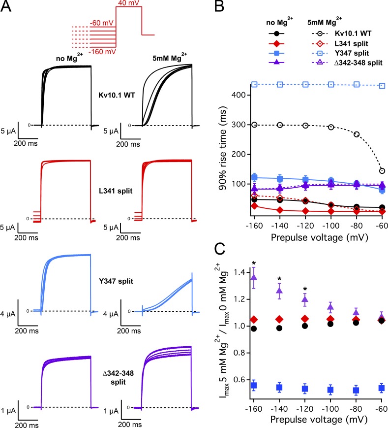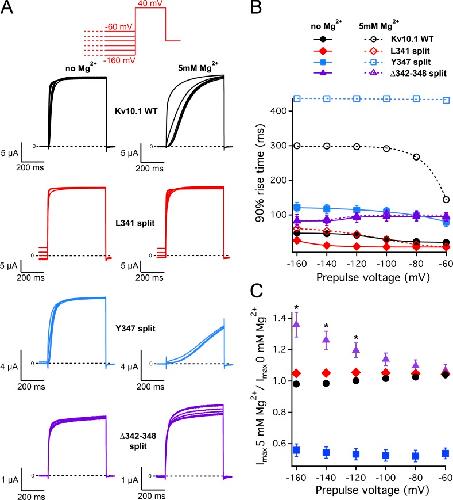 Figure 6. Effects of prepulse voltage Mg2+ on activation kinetics of specific split channels. (A) Representative currents of the wild type, L341 split, Y347 split, and Δ342–348 split elicited with the indicated voltage protocol, with (left) and without (right) 5 mM Mg2+ in the extracellular medium. In the voltage protocol, the duration of the conditioning prepulse was 5 s. (B) Time needed for current to reach 90% of the maximal value plotted against the prepulse voltage (mean ± SEM; n = 7–10). (C) The ratio of peak currents with and without Mg2+ in the extracellular medium (mean ± SEM; n = 7–10; asterisks indicate P < 0.05 in t test with Bonferroni correction with respect to the continuous channel). |