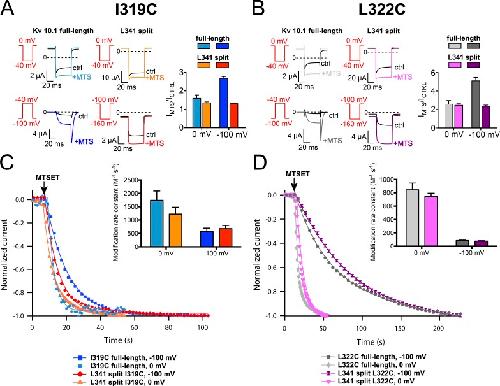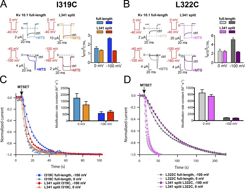 Figure 7. Voltage dependence of accessibility to MTSET overlaps between the full-length channel and L341 split. (A and B) Representative currents and mean current ratios (±SEM) from I319C (A) and L322C (B) mutants before and after application of 200 µM MTSET at 0 or −100 mV. (C and D) Representative graphs showing the time course of current changes upon MTSET application at hyperpolarized and depolarized potentials for the weakly voltage-dependent I319C site (C) and the strongly voltage-dependent L322C site (D). Curves represent single-exponential fits to data points from individual cells. Insets contain histograms with mean modification rate constants ± SEM (n = 5–8). |