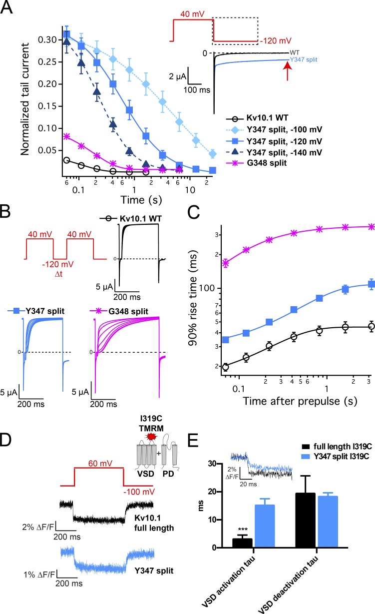 Figure 2. Alterations of channel kinetics in Y347 split and G348 split. (A) Tail current, normalized to the steady-state current at the end of the depolarizing segment of the voltage pulse, plotted against time at negative potential (mean ± SEM; n = 6). (Top right) Super slow deactivation component indicated by the red arrow. (B) Representative currents of the wild type, Y347 split, and G348 split recorded with the reactivation protocol with various intervals at â120 mV between the depolarizing pulses. (C) Time needed for current to reach 90% of its maximal value plotted against the length of the interval at â120 mV (mean ± SEM; n = 6â8). (D) Representative voltage-dependent changes of fluorescence reported by I319C-TMRM, elicited by a depolarization to 60 mV from a holding potential of â100 mV. (E) Activation and deactivation time constants obtained by exponential fits to fluorescence traces (n = 5â8; mean ± SD). Asterisks indicate statistical significance (P < 0.001). (Inset) Superimposed VCF traces from D with an expanded time base. |