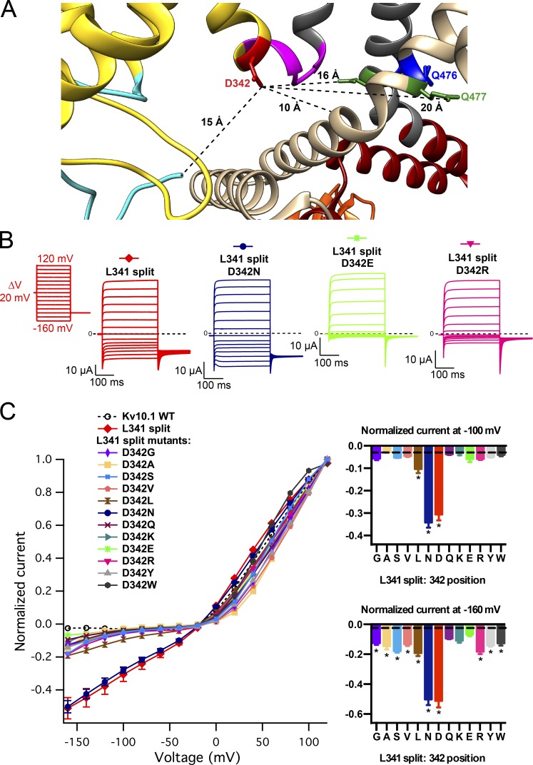 Figure 3. Restoration of wild typeâlike closure with point mutations of D342. (A) The position of D342 in the activated VSD. For clarity, only two subunits are shown, and one of them is color coded: the N-terminal PAS domain is shown in cyan, the VSD in yellow, the S4âS5 linker in magenta, the PD helices in gray, the C linker in dark red, and the CNBHD in orange. The crucial residues are color coded in both subunits: D342 in red, Q476 (S6 bundle crossing) in blue, and Q477 in green. (B) Representative currents of L341 split and selected D342 mutants in L341 split. The voltage protocol is shown at the top. (C) Normalized, mean current values plotted against voltage (n = 7â18). Error bars denote SEM. Insets contain normalized current at â100 and â160 mV plotted against the residue at 342 position (mean ± SEM). The order from left to right reflects residue size, and dashed lines indicate the current level of the wild type. Asterisks indicate statistical significance (P < 0.05 in t test with Bonferroni correction) with respect to the continuous channel. |