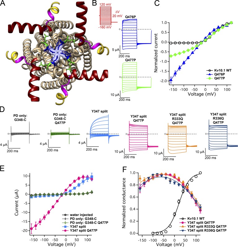 Figure 8. The presence of VSD is required for a functional permeation pathway even if access to the pore is granted by proline substitutions in S6. (A) KV10.1 pore viewed from the intracellular side. The first helix of the C linker is indicated in dark red, Q476 in blue, Q477 in green, the S4–S5 linker in magenta, and the C-terminal S4 in yellow (the part of the helix above the innermost voltage-sensing arginine is not depicted). (B) Representative current traces of Q476P and Q477P mutants in the full-length channel recorded with the indicated voltage protocol. (C) The corresponding normalized, mean current values ± SEM plotted against voltage (n = 5–11). (D) Representative currents from oocytes expressing the isolated PD (G348-C stands for the PD sequence starting from Gly348 and ending at the C terminus), Q477P mutant in the isolated PD, Y347 split and Y347 split carrying Q477P mutation alone, or in combination with additional VSD mutations. (E) Mean current values ± SEM plotted against voltage (n = 7–10; without normalization). (F) Normalized conductance values plotted against voltage. The data represent mean ± SEM (n = 6–10), and the curves are parabola fits for Q477P mutants and a Boltzmann fit for the wild type. |