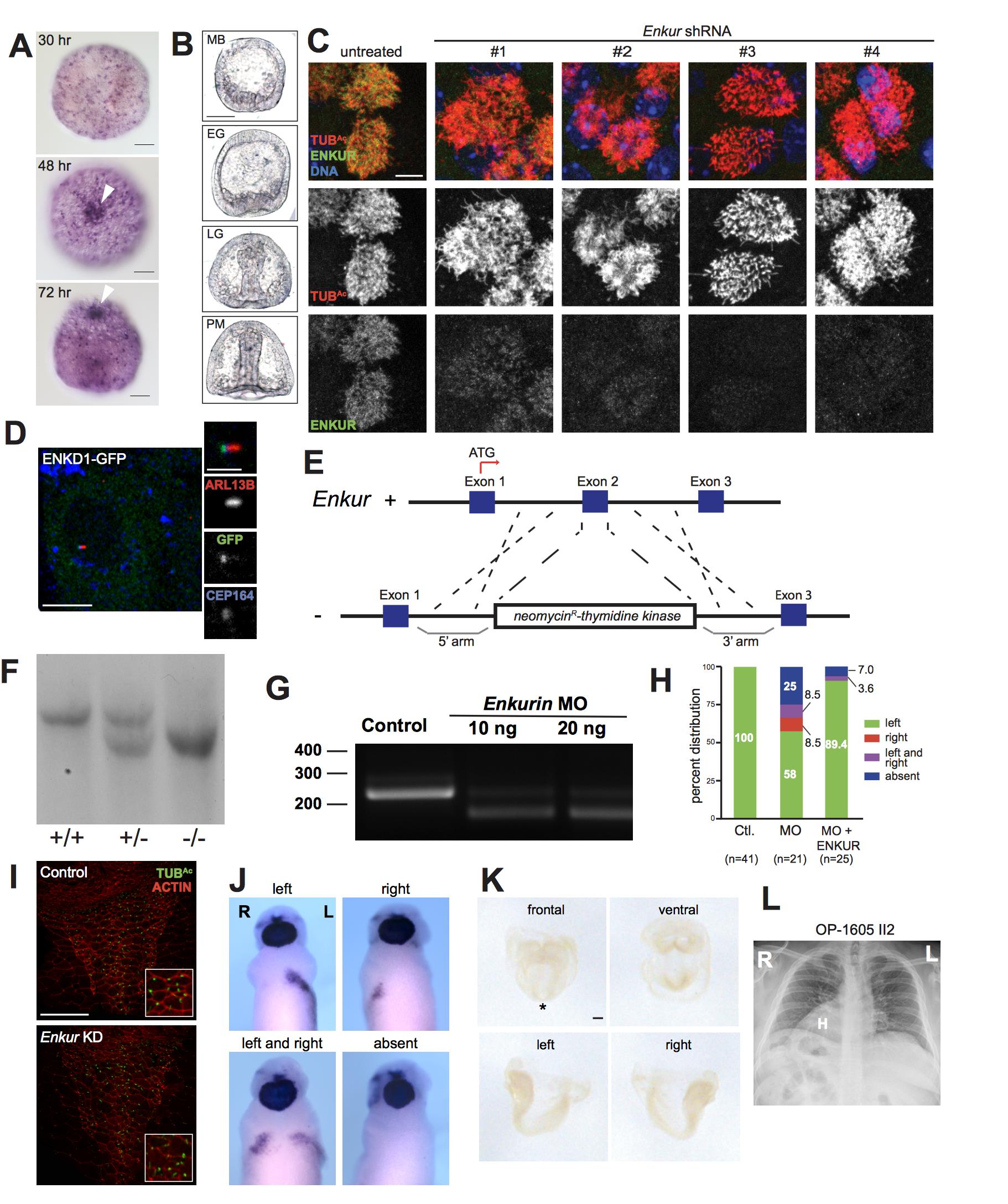 Figure S5. ENKUR supplemental data, Related to Figure 5 and 6. (A) Whole mount in situ hybridization of N. vectensis embryos at the indicated developmental stages for Enkur. Surface view indicates the heterogeneous expression of Enkur. Arrowhead marks aboral pole. Scale bar, 50μm. (B) In situ hybridization of sea urchin embryos at mesenchyme blastula (MB), early gastrula (EG), late gastrula (LG) and prism (PM) stage using the sense probe for Enkur. Scale bar, 50 μm. (C) Immunofluorescence imaging of primary cultured mouse tracheal epithelial cells for cilia (TUBac, red) and ENKUR (green). Nuclei are labeled with Hoechst (blue). Cells transfected with 4 different shRNAs against Enkur display reduced ENKUR immunofluorescence at cilia. Scale bar, 5μm. (D) Immunofluorescent staining of cilia (ARL13B, red) and ENKD1 fused to GFP (green) expressed in IMCD3 cells. ENKD1- GFP co-localizes with the basal body component CEP164 (blue). Scale bar for whole cell image, 5 μm. Scale bar for cilia only image, 2.5 μm. (E) A schematic diagram of the wild type mouse Enkur allele (+) and the targeted allele (-). The targeting vector was designed to replace part of exon 2 with a neomycin-resistance and thymidine kinase fusion. (F) Southern blot confirming homologous recombination at the mouse Enkur locus (wild type, +/+; heterozygote, +/-; homozygous mutant, -/-). (G) RT-PCR of X. laevis control embryos and those injected with 10 or 20 ng Enkur morpholino. Enkur expression is reduced in morphants. (H) Quantification of Pitx2c expression patterns in control embryos, embryos injected with Enkur MO and embryos injected with Enkur MO plus plasmid encoding sea urchin Enkur-GFP. (I) Immunofluorescence image of the Xenopus GRP depicting ACTIN (red) and cilia (TUBac, green). Ciliation of the GRP in embryos with KD of Enkur expression is similar to control embryos. Scale bar, 100μm. (J) Representative images of Pitx2 in situ hybridization in which Pitx2c expressed is on the right side, left side, both sides or is absent in Xenopus embryos (ventral view). (K) In situ hybridization of 1-4 somite stage mouse embryos using the sense probe for Enkur. Asterisk marks the node. Scale bar, 100μm. (L) A chest X-ray of affected individual OP 1605-II2 demonstrating dextracardia. The heart is indicated with an âHâ, right (R) and left (L) side of the body are indicated. |