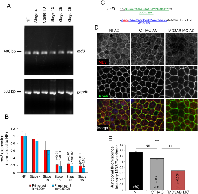 Figure 1. Marveld3 expression during Xenopus embryogenesis and morpholinos efficiency. (A) Analysis of marveld3 transcript expression by semi-quantitative RT-PCR in non-fertilized eggs (NF) and whole embryos from stage (St) 4 to 35; gapdh expression was used as a positive control; bp: base pairs. (B) Quantification of marvelD3 expression levels. Quantitative PCR was performed with two different sets of primers for marvelD3 and a pair of primers amplifying odc as a normaliser. Shown are meansâ±â1âSD of measurements with three independent mRNA isolations per developmental stage. ANOVA values are provided in the graph legend. The indicated p-values in the graph were calculated with t-tests comparing to the corresponding NF values. (C) MD3A (green) and MD3B (blue) morpholino sequences are indicated in the 5â²-end of the Xenopus marveld3 sequence; the start codon is indicated in red. (D) Analysis of MarvelD3 depletion by immunofluorescence was performed in animal caps derived from stage 8 embryos that had been injected with control or MD3AB morpholinos into both blastomeres at the 2-cell stage. MarvelD3 (red) and E-cadherin (adherens junction marker; green) expression was analyzed by immunofluorescence in animal caps explants. Scale bar, 100 μm; NI, non-injected embryos. (E) Ratio of fluorescence intensity at junctions for MarvelD3 and E-cadherin. Mann Whitney test p values are on the graph; the number of cells counted is indicated in brackets on the graph bars; black bar, NI animal caps; grey bar, control morpholino- and red bar, MD3AB morpholino-injected animal caps; red bar, MD3AB morpholino-injected animal caps. |