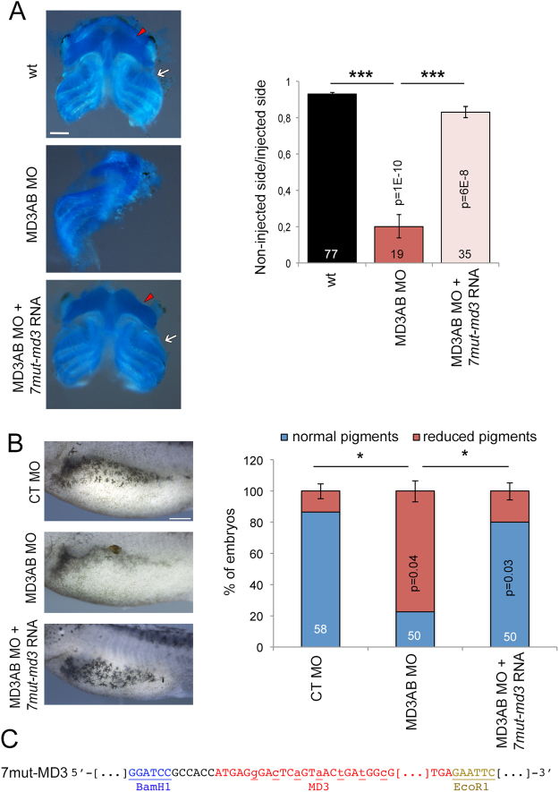 Figure 2. MarvelD3 depletion disrupts neural crest derivatives development. (A) Craniofacial cartilage morphology was analysed and its size measured in control, MD3AB morpholino-injected embryos and embryos co-injected with 7mut-marveld3 mRNA. Note, ceratohyal (red arrowhead) and ceratobranchial (white arrow) cartilage was reduced in MarvelD3 morphants. (B) The lateral line pigmentation (stage 42) pattern was analysed and quantified in control morpholino, MD3AB morpholino-injected embryos and embryos co-injected with 7mut-marveld3 mRNA. Scale bars, 500 μm; Student t-test p values and the number of embryos analysed are indicated on the graph; blue bar, normal pigments; red bar, reduced pigments; the number craniofacial cartilage samples analysed is indicated on the graph; black bar, wt; red bar, MD3AB morpholinos; light red bar, MD3AB morpholinosâ+â7mut-marveld3 RNA. (C) 7mut-marveld3 was subcloned in pCS2+âvector (BamH1/ EcoR1). Restriction sites: underlined; mutated bases of marveld3: underlined lower cases. |