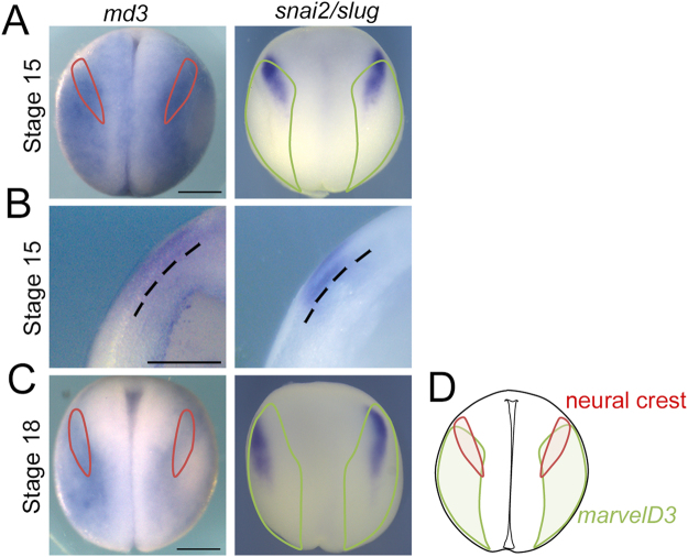 Figure 3. marveld3 transcript expression domain at neurula stage. Dorsal view of stage 15 (A) and 18 (C) whole embryos analysed for marveld3 and snai2/slug expression by Whole-mount in situ hybridization (WISH). (B) WISH analysis of marveld3 and snai2/slug expression on transversal sections of bisected embryos at stage 15. (D) Scheme representing the expression domains of marveld3 (green) and neural crest (red). |