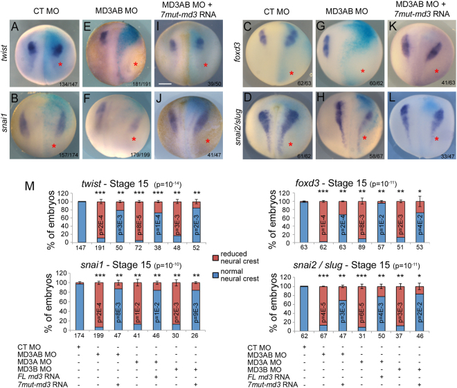 Figure 4. MarvelD3 is required for neural crest formation. Neural crest induction was analysed at stage 15 by WISH using probes against the neural crest markers twist, snai1, foxd3 and snai2/slug, respectively, in control morpholino (AâD), MD3AB morpholinos (EâH) and embryos co-injected with MD3AB morpholinoâ+â7mut-marveld3 RNA (IâL). The number of embryos analysed is indicated at the bottom right of each panel; red asterisk, injected side of the embryo with the light blue β-galactosidase staining; purple corresponds to the WISH staining; scale bar, 500âµm. (M) Quantification of neural crest induction was performed for twist, snai1, foxd3 and snai2/slug. ANOVA values are provided in parenthesis in the title of each graph. Student t-test p values and the number of embryos analysed are indicated under the graph. See Supplemental Fig. S1 for images of embryos injected with individual MD3A or MD3B morpholinos and corresponding rescue experiments. |
