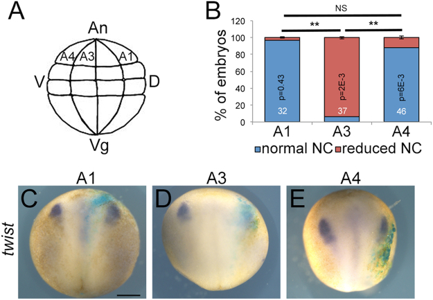 Figure 6. MarvelD3 depletion targeting a neural crest progenitor inhibits twist expression. (A) Scheme of the lateral view of a 32-cell stage embryo (adapted from Xenbase). The blastomeres are identified with from dorsal (D) to ventral (V) as A1 (mainly neural plate), A3 (mainly neural crest and epidermis) and A4 (mainly epidermis); An, animal; Vg, vegetal. (B) Neural crest induction (stage 15) was quantified by analysing twist expression by WISH in embryos injected at 32-cell stage either in the A1, A3 or A4 blastomere; Student t-test p values and the number of embryos analysed is indicated on the graph; blue bar, normal neural crest; red bar, reduced neural crest. Expression of the neural crest marker, twist by WISH in embryos injected in A1 (C), A3 (D) or A4 (E) blastomere, respectively at 32-cell stage. β-galactosidase (light blue staining) is expressed in the cells derived from the targeted blastomere. Note the reduction of twist expression only in A3 injected embryos. Scale bar, 500 μm. |