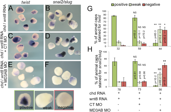 Figure 7. MarvelD3 is required for neural crest induction. Expression of the neural crest markers twist and snai2/slug during neural crest induction (stage 15) was detected by WISH in animal caps explants injected with chd mRNAâ+âwnt8 mRNA alone (A,B) and co-injected with control (C,D) or MD3AB morpholinos (E,F); scale bar, 500 μm. Neural crest induction phenotype was quantified in animal caps and classified as positive (dark green), weak (light green) and negative (red) for twist (G) and snai2/slug (H) expression. Student t-test p values and the number of animal caps analysed are indicated. |