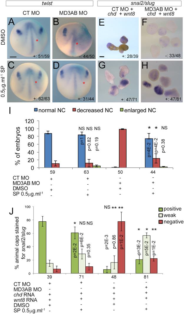 Figure 9. Rescue of neural crest formation by small molecule inhibitor for JNK in MarvelD3 depleted embryos. Neural crest induction (stage 15) was analysed by WISH against twist in control and MD3AB morpholino-injected embryos (AâD; red asterisk, injected side of the embryo with β-galactosidase staining) and against snai2/slug in animal caps explants co-injected with chd mRNAâ+âwnt8 mRNAâ+âcontrol morpholino or chd mRNAâ+âwnt8 mRNAâ+âMD3AB morpholinos. Both embryos and animal caps were treated from stage 11 to 15 with DMSO or 0,5âμg.mlâ1 SP600125, a JNK inhibitor (EâH). Neural crest induction was quantified according to twist or snai2/slug expression in embryos (I) and animal caps (J), respectively. Mann-Whitney test p values and the number of embryos or animal caps analysed are indicated; red asterisk, injected side of the embryo with light blue β-galactosidase staining. (I) blue bar, normal neural crest; red bar, reduced neural crest; (J) dark green bar, positive; light green bar, weak; red bar, negative snai2/slug staining.â+â, embryos or animal caps positive or weak for twist or snai2/slug expression; -, embryos or animal caps negative for twist or snai2/slug expression. Scale bars, 500 μm. |