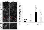 Supplemental Figure S4. JNK inhibitor efficiency in Xenopus. Analysis of SP600125 activity by immunofluorescence for p-c-Jun in non-injected (A, B) or with constitutively active-jnk mRNA-injected animal caps (C, D) treated from stage 11 to 15 with DMSO (A, C) or 0,5μg.ml-1 SP600125 (B, D). Nuclei were stained with Hoechst; red arrowheads: examples of nuclear co-localization between Hoechst and p-c-Jun staining; scale bar, 20 μm. (E) Quantification of the number of cells with a positive nuclear p-c- Jun staining / total number of cells. Mann-Whitney test p values and the total of cells counted (numbers in brackets) are indicated; the values are normalized to NI + DMSO; black bars, DMSO treated animal caps; grey bars, SP600125 treated animal caps. |