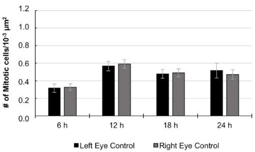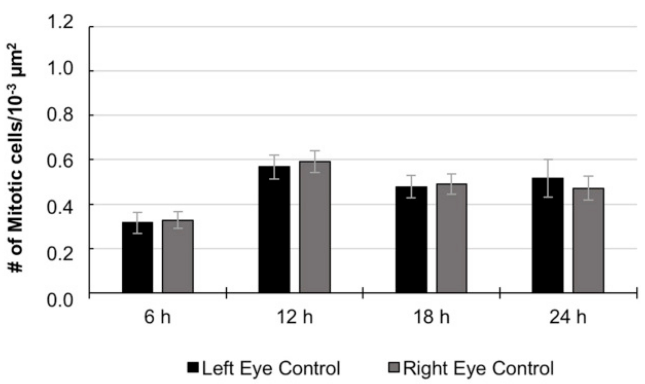 Comparison of counts of anti-phospho Histone H3 positive cells at different timepoints after st. 27 showed that there is no difference in proliferation between the left and righteyes. p>0.05, n>5 per timepoint.
