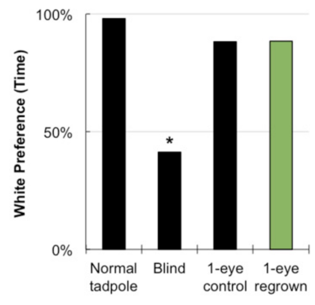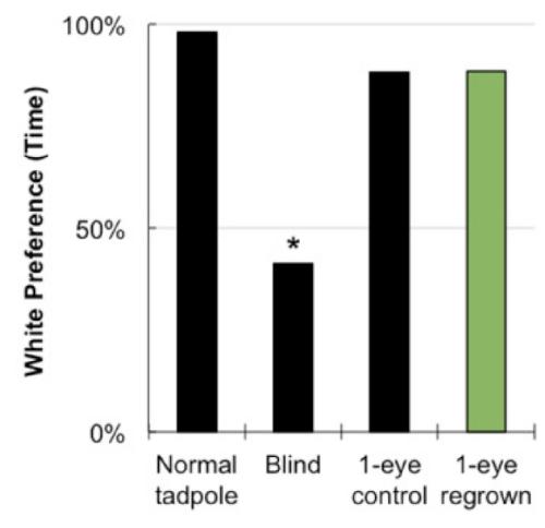 Tadpoles with one regrown eye display similar white background preference as control tadpoles with one normal eye (n=10 per condition, p>0.5). Blind tadpoles do not show preference for the white background (n=10, * denotes p<0.01 when compared to other conditions).