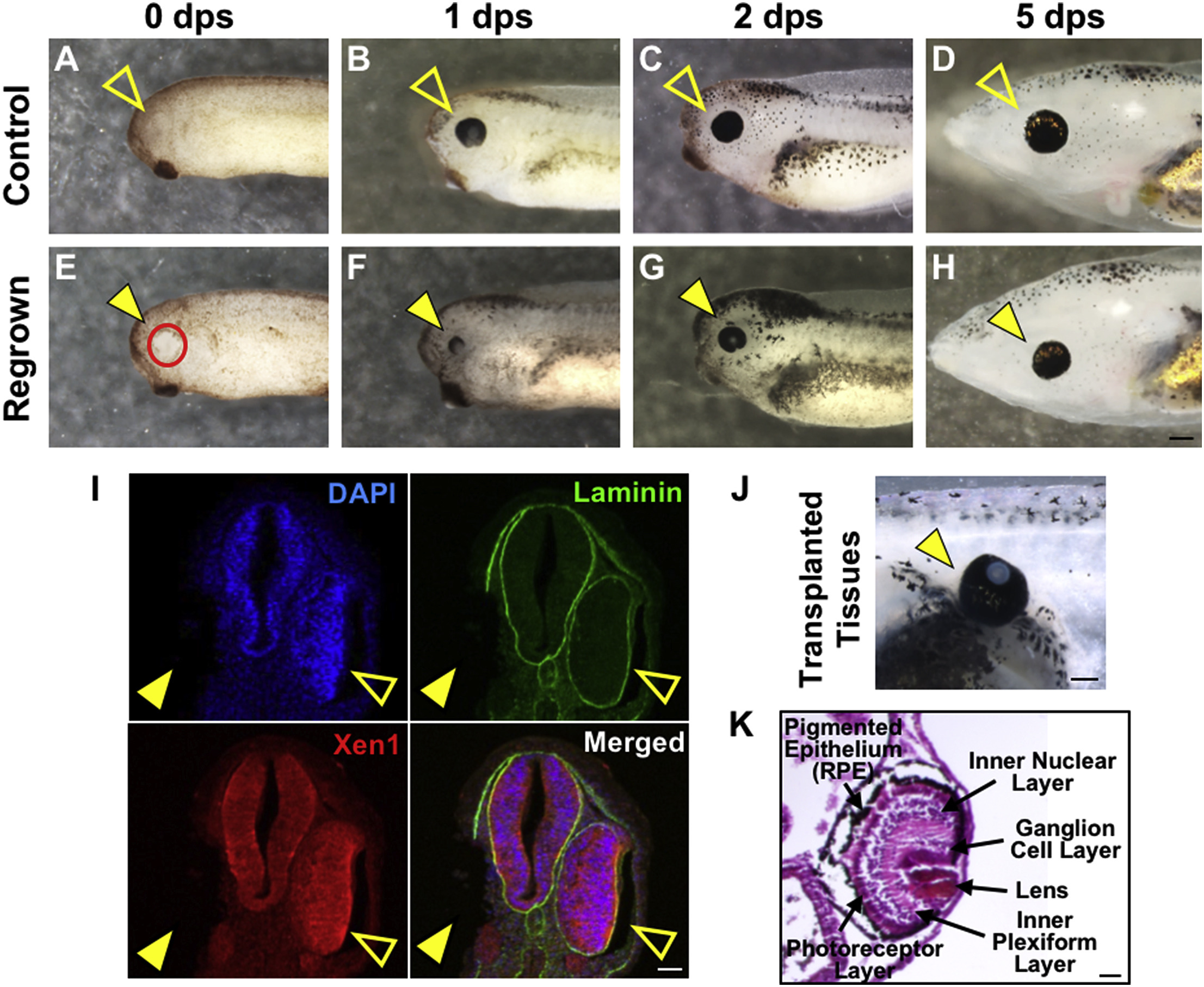Tailbud embryos regrow eyes after tissue removal. Images showing normal eye development (A-D) and the eye regrowth process (E-H) starting with st. 27â¯at the following timepoints: immediately after surgery (0), 1, 2, and 5 days (dpsâ¯=â¯days post surgery). (A-D) Open arrowheads in the upper panels indicate control, unoperated eyes. (E-H) Closed arrowheads in the bottom panels indicate regrowing eyes. The rate of full eye regrowth (as shown in H and described in Supplemental Fig. 1) was approximately 93% (nâ¯=â¯63). (I) Images are immunostained, transverse sections through the eye plane after surgery. Closed arrowheads indicate surgery site, open arrowheads indicate unoperated eye. Blue color indicates nuclear staining (DAPI). Green color indicates the basal lamina (anti-Laminin), which outlines the optic vesicle. Red color indicates neural tissues (Xen1). (J) Eye tissues removed from a st. 27 embryo were transplanted to its flank at an incision site â¼1/2 from posterior end. By 5 dps, transplanted tissues have a retina and lens similar to the contralateral control eye (not shown) in the same embryo (nâ¯>â¯20). (K) Hematoxylin and eosin stained section of transplanted tissues at 5 dps. (A-H) Upâ¯=â¯dorsal, downâ¯=â¯ventral, leftâ¯=â¯anterior, rightâ¯=â¯posterior. (I) Upâ¯=â¯dorsal, downâ¯=â¯ventral. Scale bars: A-Hâ¯=â¯200â¯Î¼m, Iâ¯=â¯25â¯Î¼m, Jâ¯=â¯200â¯Î¼m, and Kâ¯=â¯50â¯Î¼m.