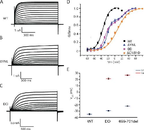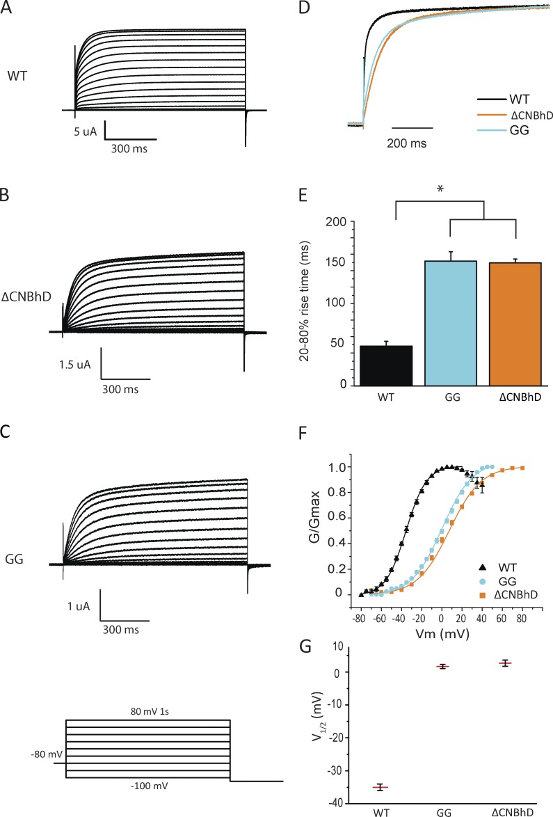 Channels in the ether-à-go-go or KCNH family of potassium channels are characterized by a conserved, C-terminal domain with homology to cyclic nucleotide-binding homology domains (CNBhDs). Instead of cyclic nucleotides, two amino acid residues, Y699 and L701, occupy the binding pocket, forming an "intrinsic ligand." The role of the CNBhD in KCNH channel gating is still unclear, however, and a detailed characterization of the intrinsic ligand is lacking. In this study, we show that mutating both Y699 and L701 to alanine, serine, aspartate, or glycine impairs human EAG1 channel function. These mutants slow channel activation and shift the conductance-voltage (G-V) relation to more depolarized potentials. The mutations affect activation and the G-V relation progressively, indicating that the gating machinery is sensitive to multiple conformations of the CNBhD. Substitution with glycine at both sites (GG), which eliminates the side chains that interact with the binding pocket, also reduces the ability of voltage prepulses to populate more preactivated states along the activation pathway (i.e., the Cole-Moore effect), as if stabilizing the voltage sensor in deep resting states. Notably, deletion of the entire CNBhD (577-708, ΔCNBhD) phenocopies the GG mutant, suggesting that GG is a loss-of-function mutation and the CNBhD requires an intrinsic ligand to exert its functional effects. We developed a kinetic model for both wild-type and ΔCNBhD mutant channels that describes all our observations on activation kinetics, the Cole-Moore shift, and G-V relations. These findings support a model in which the CNBhD both promotes voltage sensor activation and stabilizes the open pore. The intrinsic ligand is critical for these functional effects.