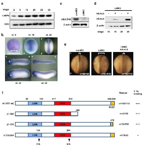 BACKGROUND: La-related protein 6 (LARP6) is an evolutionally conserved RNA-binding protein. Vertebrate LARP6 binds the 5' stem-loop found in mRNAs encoding type I collagen to regulate their translation, but other target mRNAs and additional functions for LARP6 are unknown. The aim of this study was to elucidate an additional function of LARP6 and to evaluate the importance of its function during development.