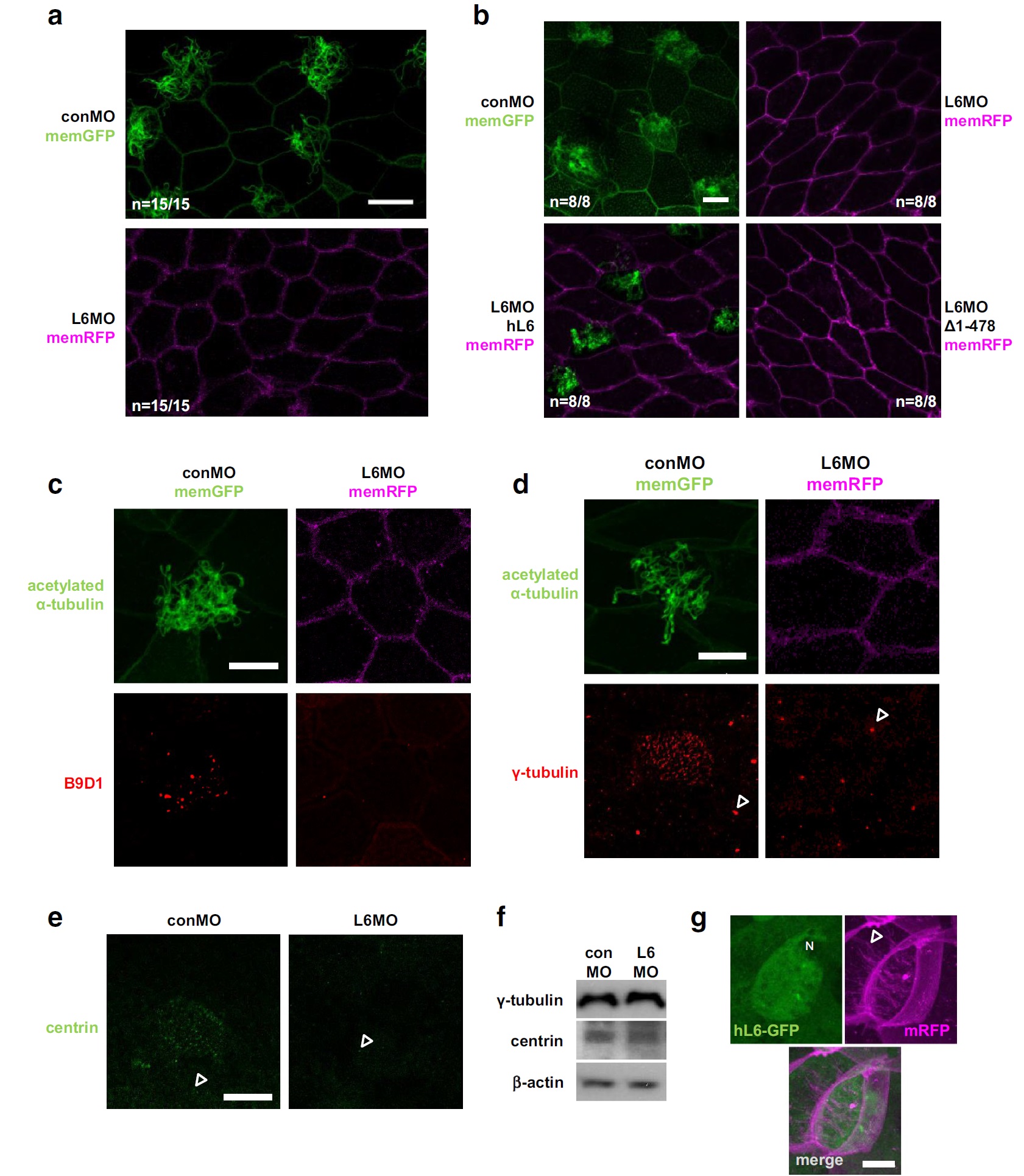 LARP6 is necessary for MCC differentiation. a Absence of cilia on epidermal MCC of LARP6 morphants. L6MO (15 ng/blastomere) with memRFP mRNA or conMO with memGFP mRNA were injected into the right side or the left side, respectively. Embryos were fixed at stage 25. Cilia were stained with an anti-acetylated tubulin antibody. Following staining, lateral explants were prepared from embryos and images from the right (L6MO) or left (conMO) lateral side were taken by confocal microscopy. b Rescue experiments with hL6 or δ1-478 mRNA in LARP6 morphant MCCs. câe B9D1, γ-tubulin and centrin proteins were not detected at the LARP6 morphant epidermis. Axonemes and ciliary transition zones or basal bodies were stained by an anti-acetylated tubulin and anti-B9D1, anti-γ-tubulin or anti-centrin antibody, respectively. Following staining, lateral explants were prepared from embryos and images were taken by confocal microscopy. Arrowheads indicate examples of centrioles. f The depletion of LARP6 did not change total amounts of γ-tubulin and centrin proteins in embryos. g The localization of LARP6 in MCCs. N nucleus. An Arrowhead indicates an example of a cilium. Scale bars 20 µm in (a), 10 µm in (bâe, g). n indicates number of embryos examined