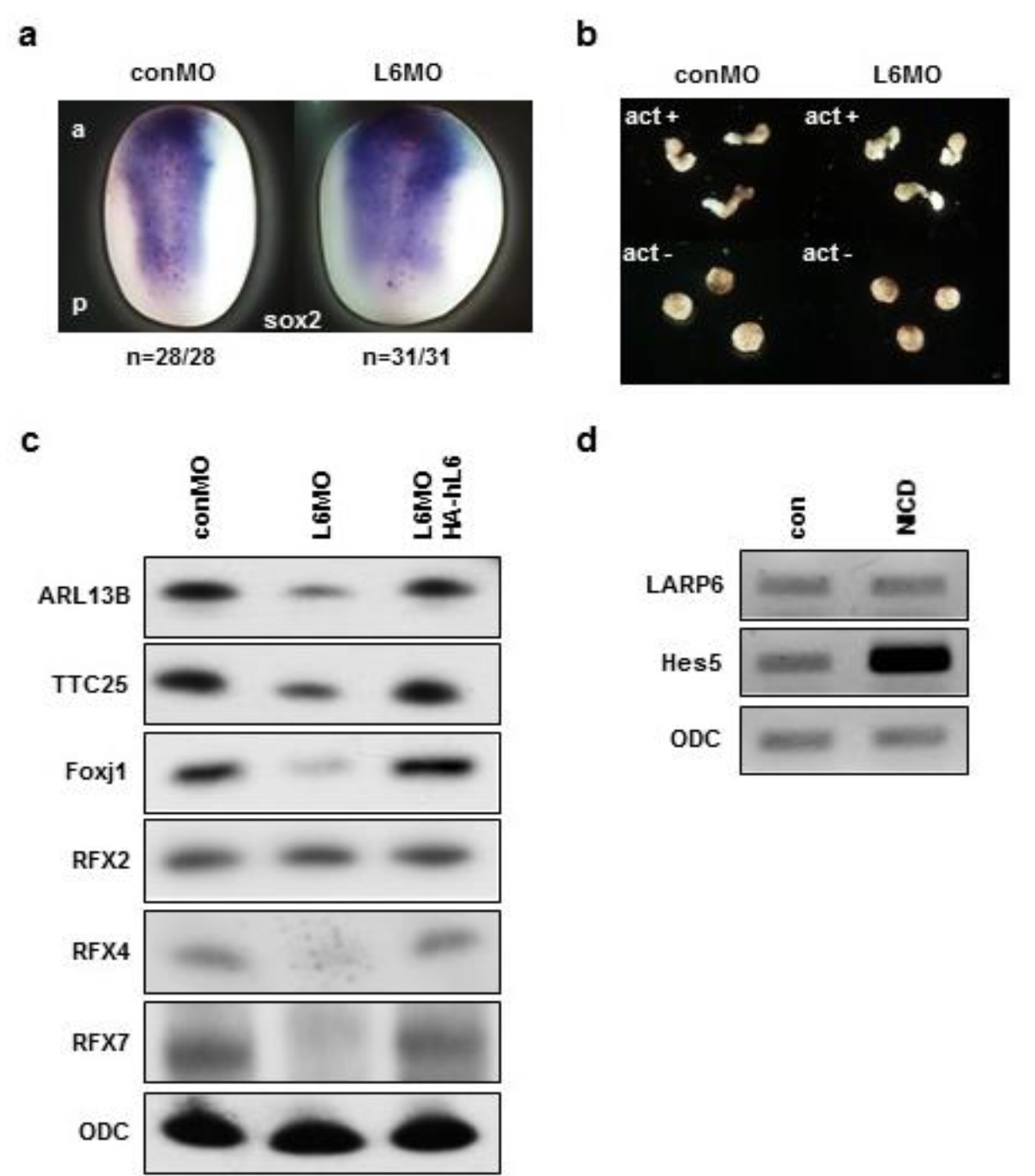 METHODS: To uncover the role of LARP6 in development, we utilized Morpholino Oligos to deplete LARP6 protein in Xenopus embryos. Then, embryonic phenotypes and ciliary structures of LAPR6 morphants were examined. To identify the molecular mechanism underlying ciliogenesis regulated by LARP6, we tested the expression level of cilia-related genes, which play important roles in ciliogenesis, by RT-PCR or whole mount in situ hybridization (WISH).