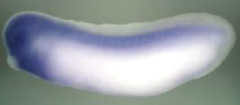) gene expression in Xenopus laevis embryo, assayed via in situ hybridization, NF stage 20, dorsal view, anterior up.