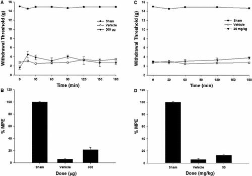 Figure 5. Antiallodynic effects of SNL rats by intrathecal (A,B) or oral (C,D) administration of compound 28. The withdrawal threshold or the percentage of maximal possible effect (% MPE) represents the mean ± SEM of 5–6 rats for each experimental group. Intrathecal or oral administration of compound 28 did not show any antiallodynic effects.