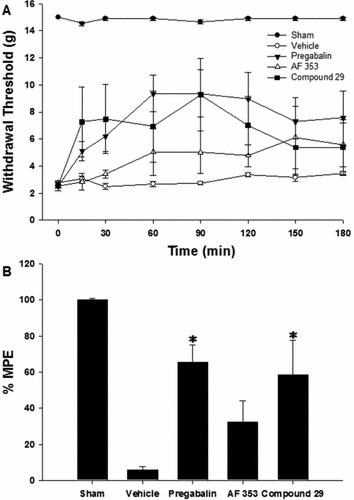 Figure 2. Antiallodynic effects of SNL rats by intrathecal administration of pregabalin, AF353 and compound 29. The withdrawal threshold or the percentage of maximal possible effect (% MPE at 1 μg) represents the mean ± SEM of 5–6 rats for each experimental group. The antiallodynic efficacies of pregabalin (65 ± 9%), AF353 (32 ± 11%), and compound 29 (58 ± 19%) were observed in SNL rats. Compared with vehicle, *P < 0.05.