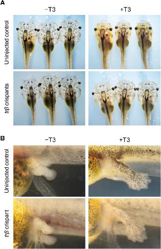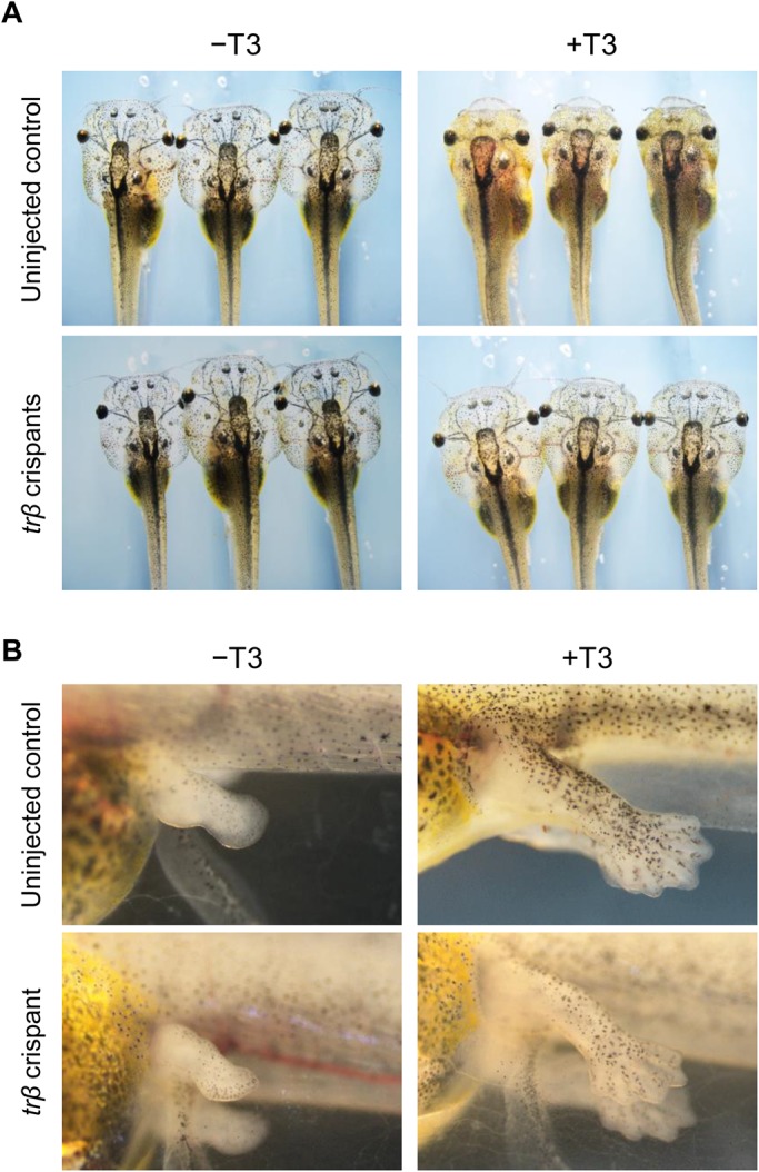 Fig. 3. Morphological changes induced by T3 treatment in trβ crispants. (A) Uninjected control tadpoles and trβ crispants at pre-metamorphic stage (stage 52–54) were treated with or without 10 nM T3 for 3 days and morphological changes observed. After 3 days of T3 treatment, regression of gills was observed in all uninjected control tadpoles (n=44/44), whereas these morphological changes were not induced in most of the trβ crispants (n=51/54). In contrast, morphological change did not occur in the gills of both uninjected control tadpoles and trβ crispants without T3 treatment. (B) Hind limb development was induced by T3 treatment in all uninjected control tadpoles (n=44/44) and trβ crispants (n=54/54). N values represent the total numbers of tadpoles in three independent experiments.