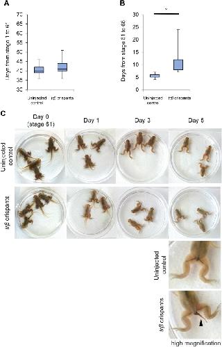 Fig. 5. Delay of tail resorption in trβ crispants during natural metamorphosis. (A) The days from fertilization to stage 61 are indicated in a box plot for uninjected control tadpoles (n=46) and trβ crispants (n=39). There were no significant differences. (B) The days from stage 61 to stage 66 are indicated in a box plot for uninjected control tadpoles (n=45) and trβ crispants (n=38). trβ crispants required significantly more days to reach stage 66 (Welch's t-test, *P<0.05). N values represent the merged total numbers of tadpoles from two independent experiments. Box and whiskers show the interquartile range and maximum and minimum data points, respectively. (C) Time course of tail resorption in uninjected control tadpoles and trβ crispants. Uninjected control tadpoles and trβ crispants of the same age were selected from the same clutch at stage 61 and gill resorption observed at 1 days, 3 days, and 5 days after stage 61 (day 0). Uninjected control tadpoles completed tail resorption by day 5. In contrast, the tail remained in trβ crispants on day 5 (an arrowhead in the high magnification image) and a longer time was required to reach the end of metamorphosis.