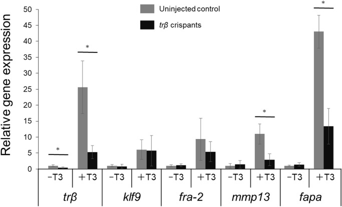 Fig. 4. Impaired induction of TH-response genes in trβ crispants. mRNA expression of five TH response genes, thyroid hormone receptor β (trβ), krüppel-like factor 9 (klf9), fos-related antigen-2 (fra-2), matrix metallopeptidase 13 (mmp13), and fibroblast activation protein alpha (fapa), was analyzed by qPCR. Uninjected control tadpoles and trβ crispants at pre-metamorphic stage (stage 52–54) were treated with or without 10 nM T3 for 3 days and at least four tadpoles were pooled per sample (n=3) in three independent experiments. The expression levels were normalized by rpl8. Expression changes by T3 induction were calculated relative to those of control animals without T3 treatment. Error bars represent ±s.d. (n=9). The three independent experiments exhibited similar trends. Asterisks indicate significant differences between the uninjected control and trβ crispants: *P<0.005; Welch's t-test.