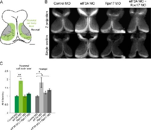 Figure 6âfigure supplement 1. eIF3A and RPS17 regulate protein synthesis in the tadpole tectum.(A) Schematic of tadpole optic tectum showing the location of neuronal cell body layer (green) where tectal neuronal somata (black) extend processes into the neuropil (gray). MOs were electroporated into the tectum, and two day later AHA was injected into the midbrain ventricle. Tadpole brains were dissected 1 hr later and processed for click chemistry, which tags AHA with a fluorophore for visualization of AHA-labeled proteins. (B) Images of fluorescent AHA labeling in z-projections through optic tectum (top) or single confocal optical sections from comparable depths in optic tectum (bottom) from animals electroporated with control MO, eIF3A MO, RPS17 MO, or both eIF3A and RPS17 MO. In vivo AHA labeling detected 1 hr after ventricular AHA injection is increased by knockdown of eIF3A in both the neuronal cell body layer and neuropil. Knockdown both eIF3A and RPS17 only increase AHA labeling in the neuropil. (C) Normalized AHA labeling in the neuronal cell body layer and neuropil in animals treated with control MO, eIF3A MO, RPS17 MO, or both eIF3A and RPS17 MO. Control MO: 1 ± 0.04 in neuronal cell body layer and 1 ± 0.04 in neuropil, n = 14 brains; eIF3A MO: 1.91 ± 0.15 in neuronal cell body layer and 1.81 ± 0.3 in neuropil, n = 7 brains; RPS17 MO: 1 ± 0.07 in neuronal cell body layer and 1.21 ± 0.09 in neuropil, n = 12 brains; eIF3A plus RPS17 MO: 1.13 ± 0.05 in neuronal cell body layer and 1.36 ± 0.09 in neuropil, n = 19 brains. *=p < 0.05, **=p < 0.01, Steel-Dwass test was used for nonparametric multiple comparisons between all pairs. Error bars represent ±SEM. Scale bar = 100 μm. |