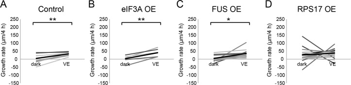 Figure 4âfigure supplement 1. Newly synthesized FUS is required for visual experience-dependent structural plasticity.(AâD) To test the effect of overexpression of CPPs on structural plasticity in response to VE, tecta were electroporated with GFP-expression plasmid 2 days before imaging. GFP-expressing tectal neurons were imaged in vivo before and after 4 hr in dark followed by 4 hr of VE. Dendritic arbors of individual neurons were reconstructed in 3D and total dendritic branch length (TDBL) was compared across imaging time-points for individual neurons. (AâD) Plots of VE-dependent changes in tectal neuron growth rate over 4 hr in dark and VE in tecta electroporated with GFP-expression plasmid (A), GFP and eIF3A-expression plasmid (B), GFP and FUS-expression plasmid (C), or GFP and RPS17-expression plasmid (D). Gray lines connect data points for individual neurons and black lines are the average changes in growth rate in dark and VE. Neurons treated with control GFP-expression plasmid increase growth rate with VE compared to dark. Overexpression of RPS17 blocked the VE-dependent increase in dendritic arbor growth. VE-dependent structural plasticity was unaffected by eIF3A or FUS overexpression. Control: n = 8 cells; eIF3A OE: n = 6 cells; FUS OE: n = 11 cells; RPS17 OE: n = 17 cells. *p<0.05, **p<0.01, Two-tailed paired Studentâs t test were used to compare between two matched pairs. |
