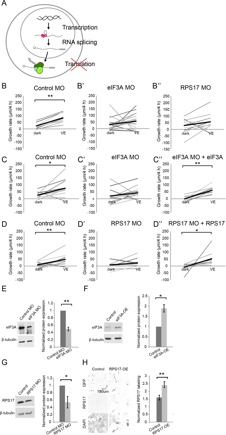 Figure 5. Newly synthesized eIF3A and RPS17 are required for visual experience-dependent structural plasticity.(A) Schematic of different steps of regulation in gene and protein expression. (BâDââ) VE-dependent changes in tectal neuron dendritic arbor growth rate over 4 hr in dark and VE in tecta electroporated with control MO (B, C, D), designated CPP MOs (Bâ, Bââ, Câ, Dâ), or CPP MOs and rescue constructs (Cââ, Dââ). Gray lines connect data points for individual neurons and black lines are average changes in TDBL in dark and VE. (BâBâ) VE-dependent changes in growth rate in tecta treated with control MO (B, eIF3A MO (Bâ), or RPS17 MO (Bââ). Control MO: n = 22 cells; eIF3A MO: n = 17 cells; RPS17 MO: n = 10 cells. Both eIF3A MO and RPS17 MO blocked the VE-dependent increase in dendritic arbor growth rate observed in controls. (CâCââ) Co-expression of eIF3A MO and exogenous eIF3A rescued the deficit in VE-induced structural plasticity seen with eIF3A knockdown. Control MO: n = 10 cells; eIF3A MO: n = 14 cells; eIF3A MO + eIF3A: n = 7 cells. (DâDââ) Co-expression of RPS17 MO and exogenous RPS17 rescued the deficit in VE-induced dendritic structural plasticity seen with RPS17 knockdown. Control MO: n = 9 cells; RPS17 MO: n = 10 cells; RPS17 MO + RPS17: n = 9 cells. (EâH) Validation of eIF3A and RPS17 knockdown and OE. (E, F) Left: representative WB of eIF3A and β-tubulin from tecta electroporated with eIF3A MO (E) or MO-insensitive eIF3A expression construct (F) compared to controls. Right: eIF3A MO significantly decreased synthesis of eIF3A protein (eIF3A MO: 0.5 ± 0.05, p=0.0003; n = 5 independent experiments) and the eIF3A expression construct generated significantly more eIF3A protein (eIF3A-OE: 1.89 ± 0.18, p=0.0198; n = 3 independent experiments). (G) Left: WB of RPS17 and β-tubulin from tecta electroporated with control or RPS17 MO. Right: Normalized RPS17 expression levels in tecta electroporated with control or RPS17 MO. RPS17 MO significantly reduced synthesis of RPS17 protein (RPS17 MO: 0.54 ± 0.16, p=0.0309; n = 4 independent experiments). (H) Left: Images of GFP (top), RPS17 (middle) expression and DAPI (bottom) labeling in HEK cells expressing GFP alone (Control, left) or GFP and RPS17 (right). Right: RPS17 expression in GFP+ ROI, normalized to RPS17 expression in GFP- ROI. The RPS17 expression construct increased RPS17 immunolabeling. Control: 1.6 ± 0.16; RPS17-OE: 2.43 ± 0.19; p=0.0029; n = 7 different fields imaged from two independent experiments for each experimental condition. *p<0.05, **p<0.01, two-tailed paired Studentâs t test were used to compare between two matched pairs (BâD) and one-tailed Studentâs t test for comparisons of two independent groups (EâH). Error bars represent ±SEM (EâH).10.7554/eLife.33420.015Figure 5âsource data 1. Values of VE-dependent changes in tectal neuron growth rate over 4 hr in dark and VE presented in Figure 5BâBââ, Figure 5CâCââ, and Figure 5DâDââ.Raw values of normalized protein expression of eif3A or RPS17 in tecta electroporated with control/eif3A MO, control/eIF3A expression construct, or control/RPS17 MO presented in Figure 5EâG. Raw values of normalized protein expression of RPS17 in HEK cells transfected with control or RPS17 expression construct presented in Figure 5H. |
