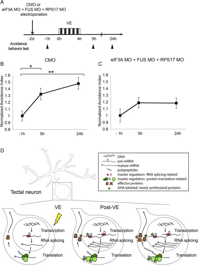 Figure 7. Knockdown of eIF3A, RPS17, and FUS blocks visual experience-dependent behavioral plasticity.(A) Protocol to evaluate the effect of eIF3A, FUS, and RPS17 knockdown on visual avoidance behavior. Tecta were electroporated with control MO or eIF3A MO + RPS17 MO + FUS MO and 2 days later were assayed for baseline visual avoidance behavior at −1 hr, exposed to VE for 4 hr and assayed for visual avoidance behavior 5 hr and 24 hr after the onset of VE. (B) VE-induced behavioral plasticity in control animals was detected at 5 hr and maintained at 24 hr. (C) Triple knockdown blocked behavioral plasticity. AI values were normalized to baseline at −1 hr (B–C). (B–C) CMO: AI = 1 ± 0.07, 1.32 ± 0.09, or 1.48 ± 0.09; n = 21, 27, or 31 animals for tests at −1 hr, 5 hr, or 24 hr; eIF3A MO + RPS17 MO + FUS MO: AI = 1 ± 0.10, 1.19 ± 0.08, or 1.18 ± 0.08; n = 22, 33, or 33 animals for tests at −1 hr, 5 hr, or 24 hr. *=p < 0.05, **=p < 0.01, the Steel-Dwass test was used for nonparametric multiple comparisons with control. Error bars represent ±SEM. (D) Schematic of visual experience-induced dynamics in protein synthesis machinery. By combining BONCAT and DiDBiT, we identified CPPs including master regulators that control gene expression or protein translation, such as eIF3A, FUS, and RPS17, and effector proteins that maintain plasticity in response to VE, such as cytoskeletal proteins. Functional analysis of select CPPs suggests that de novo synthesis of master regulators is required for experience-dependent plasticity. Our data suggest that the experience-dependent changes in the nascent proteome result from a combination of direct changes in synthesis of master regulators and effector proteins, and secondary effects downstream of differential synthesis of master regulators.10.7554/eLife.33420.021Figure 7—source data 1. Quantification of normalized AI values data presented in Figure 7B–C. |