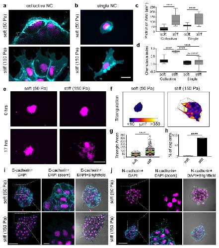 Extended Data Figure 3. Neural crest motility, dispersion, and EMT are controlled by substrate mechanics.(a–d) Protrusion and chemotaxis analysis of collective and single NC cells plated on soft and stiff substrates. (a) Confocal projections of labelled NC collectives plated on soft or stiff gels. (b) Confocal projections of labelled single NC cells plated on soft or stiff gels. (c) Protrusion area and (d) chemotaxis quantifications for collective and single NC cells plated on soft or stiff gels, boxes show the 25th, median, and 75th percentiles; whiskers show the spread of data (excluding outliers) Nprotrusion_area= 63 cells, Nchemotaxis= 79 cells (one-way ANOVA P <0.0001, two-tailed t-test ****P<0.0001, CI= 95%). (e–h) NC dispersion analysis on gels of varying stiffness. (e) NC cells labelled with nRFP and plated on stiff or soft gels are shown at 0 and 17 hours after plating. (f–h) quantification of cell dispersion. (f) Color-coded Delaunay triangulation shown at 17 hours after plating to facilitate visualization of the distances between neighbor cells. (g) Quantification of Delaunay triangulation, spread of data for each condition is plotted, green lines represent median, red whiskers the interquartile range (two-tailed Mann–Whitney, ****P<0.0001, CI= 95%, Ng= 730 triangles from 31 explants. (h) percentage of dispersing explants, histograms represent media and error bars s.e.m. (two-tailed t-test ****P<0.0001, CI= 95%, Nh= 31 explants) g and h, are data from 4 independent experiments (soft) and 3 independent experiments (stiff). (I,j) Immunostaining for (i) E-cadherin and (j) N-cadherin on NC plated on substrates of varying stiffnesses. a–b,e,i,j representative examples of 3 independent experiments. Scale bars (a,b) 20 μm, (e) 250 μm, (I,j) 50 μm, (I,j, zoom) 10 μm. |