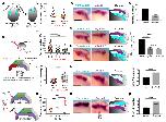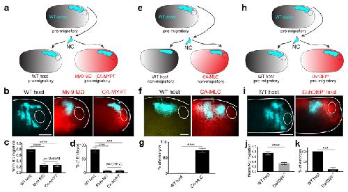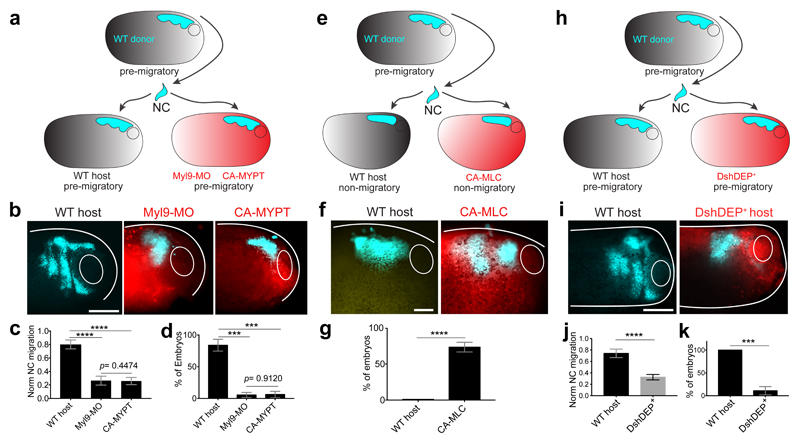 Extended Data Figure 5. Mesodermal stiffening promotes neural crest collective migration in a non-autonomous manner in vivo.(a–d) Non-autonomous effect of mesodermal myosin manipulations on NC migration in vivo. (a) Wild type labelled pre-migratory NC (cyan) grafted into pre-migratory wild type (WT), Myl9-MO, or CA-MYPT injected hosts (mesoderm in red). (b) Representative embryos showing normal NC migration in WT hosts and inhibited NC migration in Myl9-MO or CA-MYPT hosts. (c) Normalised NC migration N= 22 animals and (d) percentage of embryos displaying NC migration (one-way ANOVA P <0.0001; two-tailed t-test ***P<0.0006, ****P<0.0001, CI= 95%, N= 38 animals). Histograms in c, d, g represent media, error bars in c SD or s.e.m in d,g. (e–g) Effect of premature mesodermal stiffening on NC migration in vivo. (e) Wild type labelled pre-migratory NC grafted into non-migratory wild type (WT), or CA-MLC hosts. (f) Representative embryos showing premature NC migration in CA-MLC hosts, while no migration is observed in control embryos at this stage. (g) Percentage of embryos displaying NC migration, two-tailed t-test ****P<0.0001, CI= 95%, N= 20 animals. (h-k) Non-autonomous effect of DshDEP+ on NC migration. (h) Wild type labelled pre-migratory NC (cyan) was grafted into pre-migratory wild type (WT), or DshDEP+ hosts. (i) Representative examples showing NC migration in WT hosts and inhibited NC migration on DshDEP+ injected hosts (mesoderm in red). (j) Normalised NC migration and (k) percentage of embryos displaying NC migration (two-tailed t-test ***P<0.0002 ****P<0.0001, CI= 95% N= 14 animals). Histograms in j, k represent media and error bars (j) s.e.m and (d) SD. b,f,i are representative examples of 3 independent experiments. Scale bars (b) 200 μm, (f) 100 μm, (i) 150 μm. |
