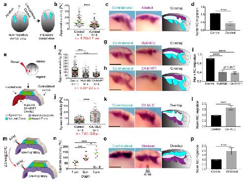 Figure 2. Mesodermal stiffening is essential for neural crest collective migration in vivo.(a–d) Ablation experiments. (a) Schematic showing ablation at non-migratory stages, and NC migration at stage-23 (migratory). (b) iAFM measurements, n= number of AFM-indentations ncontrol= 78, nablated= 86. (c) Lateral views of embryos hybridised with a probe against snail2 to analyse NC migration. (d) Normalised NC migration (Nd= 10 animals). (e–l) Mesoderm targeted injections. (e) Embryos injected into two dorso-vegetal blastomeres (prospective mesoderm). (f,j) iAFM measurements. f, ncontrol= 294, nMyl9-MO= 224, nCA-MYPT= 223; in j, ncontrol= 120, nCA-MLC= 301. (g, h, k)