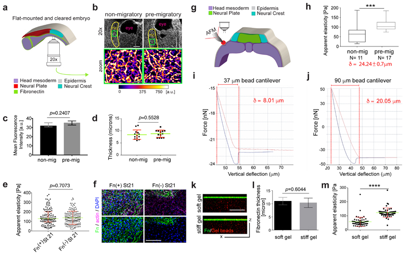 Extended Data Figure 2. Fibronectin expression under the neural crest in vivo and contribution to tissue stiffness, stiffness measurements across epidermis, and ex vivo system characterisation.(a–d) Analysis of Fibronectin expression under the NC. (a) Schematic showing the imaging method used to access Fibronectin under the NC. (b) Immunostaining for Fibronectin on embryos at non- and pre-migratory stages. 20x panels, yellow outline is highlighting the anatomical position of the NC, green box highlights the region showed in the zoom panels. Zoom panels show heat maps of Fibronectin signal (representative of 5 independent samples). (c) Fluorescence signal intensity, histogram represents media and error bars SD (two-tailed t-test, CI= 95%). (d) Fibronectin signal thickness in the mesoderm at pre- and non-migratory stages, green lines represent media and red whiskers SD; Nc= 10 animals, Nd= 26 sections from 3 independent experiments (two-tailed t-test, CI= 95%). Scale bars (20x panels) 50 μm, (zoom panels) 20 μm. NC, neural crest. (e–f) Apparent elasticity was measured before and after mechanical removal of the ECM by gently scraping the surface of the tissue with a hair loop. (e) Apparent elasticity was measured directly on the mesoderm in the presence Fn(+) or absence Fn(-) of Fibronectin (Fn, green) in embryos at stage 21 (pre migratory). Spread of data is plotted, green lines represent median, red whiskers interquartile range (two-tailed Mann–Whitney, ***P<0.0006, CI= 95%, n= number of AFM-indentations, nfn(+)= 124, nfn(-)= 157). Average indentation depth= 8μm. (f) Immunostaining against Fibronectin (Fn), conditions as indicated. two-tailed Mann Whitney test, p value as indicated, N= 7 embryos. Scale bar 100 μm. (g–h) AFM controls. (g) Schematic of iAFM measurement. To control that the dissection of the epidermis did not modify the mesodermal elasticity we measured the elastic moduli through the epidermis and no differences were observed (compare with Fig. 1h). (h) Apparent elasticity, boxes show the 25th, median, and 75th percentiles; whiskers show the spread of data (excluding outliers) (two-tailed Mann–Whitney, ***P=0.0006, CI= 95%, N= number of animals δ= average indentation depth). (i–j) Representative examples of force curves obtained from measurements performed using cantilevers coated with either (i) 37 μm beads, ni= 2386 or (j) 90 μm beads, nj= 28; (red lines represent cantilever extension and dark blue lines retraction). Indentation depth (δ) for each curve is provided. (k–m)