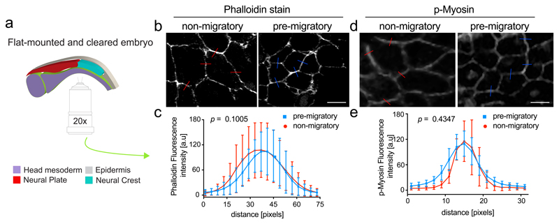 Extended Data Figure 8. Actomyosin expression in the head mesoderm does not change from non- to pre-migratory stages.(a–e) Analysis of actin and phospho-myosin expression under the NC. As actomyosin contractility has been proposed to contribute to paraxial mesoderm stiffness in Xenopus13, we assessed actomyosin activity in the head mesoderm, the substrate of the NC. Note that the expression levels of either actin or p-myosin remained unchanged at pre-migratory stages compared to non-migratory stages. (a) Schematic showing the imaging method used to access the head mesoderm under the NC. (b) Phalloidin stain was used to label actin on embryos at non- and pre-migratory stages. (d) Immunostaining against phospho-myosin on embryos at non- and pre-migratory stages. (c–e) quantification of fluorescence intensity across the membrane represented by a continuous line, each point represents media and error bars SD; n, number of measurements per data (time) point, nc= 16, ne= 15, from 3 independent experiments, non-significant differences were observed, p value is indicated in each chart (two-tailed t-test, CI= 95%). Scale bars 20 μm. |