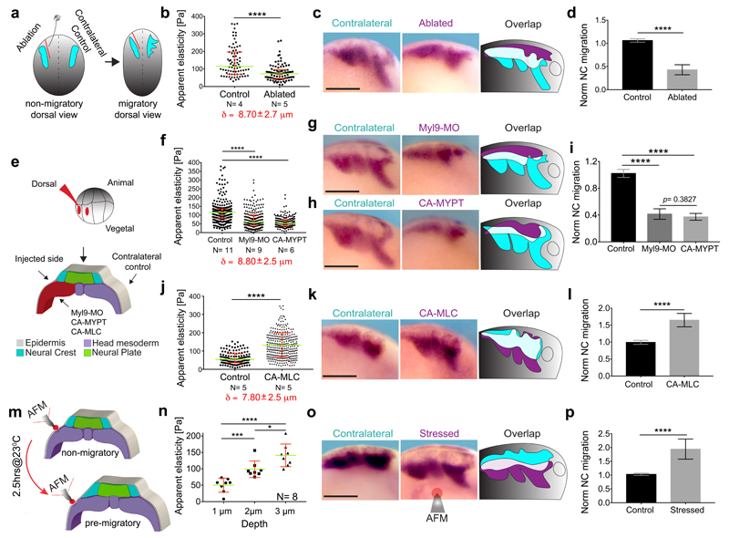 snail2-hybridised embryos. (p) Normalised NC migration (Np= 13 animals). Overlap drawing in c,g,h,k,o shown to facilitate comparison of NC migration, control NC (cyan) and treated NC (magenta). b,f,j iAFM measurements direct on mesoderm, spread of data; green lines represent median, red whiskers interquartile range (two-tailed Mann–Whitney, ****P<0.0001, CI= 95%, N= number of animals, δ= averaged maximum indentation depths). Histograms in d,i,l,p represent media, error bars SD (one-way ANOVA P <0.0001; two-tailed t-test *P=0.014, ***P <0.001, ****P<0.0001, CI= 95%). c,g,h,k,o representative examples from three independent experiments. Scale bars 200 μm. |