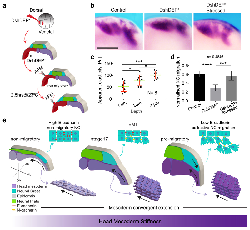 Figure 4. PCP loss-of-function is mechanically rescued by extrinsically inducing mesodermal stiffening.(a–d) Mechanical rescue of DshDEP+ induced defects. (a) Graphic description of compression experiments. (b) Lateral view of snail2-hybridised embryos. (c) Induced apparent elasticity plotted as a function of indentation depth, Nc= 8 animals, green lines represent median and whiskers show the spread of data (excluding outliers). (d) Normalised NC migration, N= 19 animals. b,d representative examples from three independent experiments. Histograms in c, d represent media and error bars SD (one-way ANOVA P <0.0003; two-tailed t–test *P<0.045, ***P<0.0002, ****P<0.0001, CI= 95%, δ = average indentation depth. Scale bars (b) 200 μm. (e) Schematic representing how mechanical interaction between mesoderm and NC coordinates morphogenesis. As convergent extension progress, the mesoderm stiffens, and in turns, NC epithelial-to-mesenchymal transition (EMT) is triggered and CCM proceed (AP, anteroposterior; ML, mediolateral; DV dorsoventral). NC, Neural crest. |
