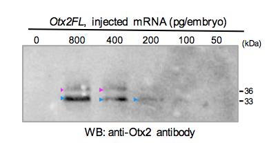 Fig. S3. The detectionlimit ofOtx2FLby western blotting. Embryos were injected with Otx2FL mRNA at various doses as indicated. Modified bands of Otx2FL was clearly detected when Otx2FL mRNAs were injected at higher than 200 pg per embryo. Embryonic lysate of 0.42 equivalent embryo was loaded per lane. Otx2FL was detected by western blotting with anti@Otx2 antibodies. Blue arrowheads, nascent proteinY magenta arrowheads, modified proteins. |