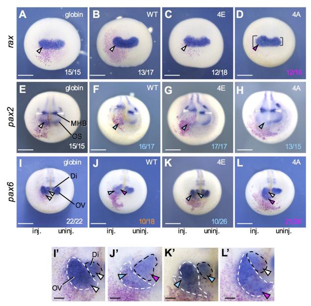 Fig. 4. Effects of Otx2 mutants on eye marker genes. Embryos were co-injected on the right side with mRNA for globin, WT, 4E or 4A (20 pg/embryo) and nbgal as described in the legend to Fig. 3, and were subjected to WISH for rax (A-D), pax2 (E-H) and pax6 (I-L) at early neurula stages (stages 13- 14, A-D) or late neurula stages (stages 18-20, E-L). The fractions indicate the proportion of the presented phenotype per total number. Colors of numbers: white indicates normal expression; magenta indicates upregulation; blue indicates downregulation; orange indicates combined effects of enlarged Di and reduced OV. Square brackets indicate the sizes of the eye field showing the difference between left and right. Open arrowhead indicates the position of MHB. Anterior view with dorsal up. (Iâ²-Lâ²) Enlarged images of I-L. Dashed black and white lines indicate Di and OV, respectively, where pax6 is expressed. Colors of arrowheads: white indicates normal expression; magenta indicates upregulation; blue indicates downregulation (A-Lâ²). Scale bars: 500 μm in A-L; 100 μm in Iâ²-Lâ². |