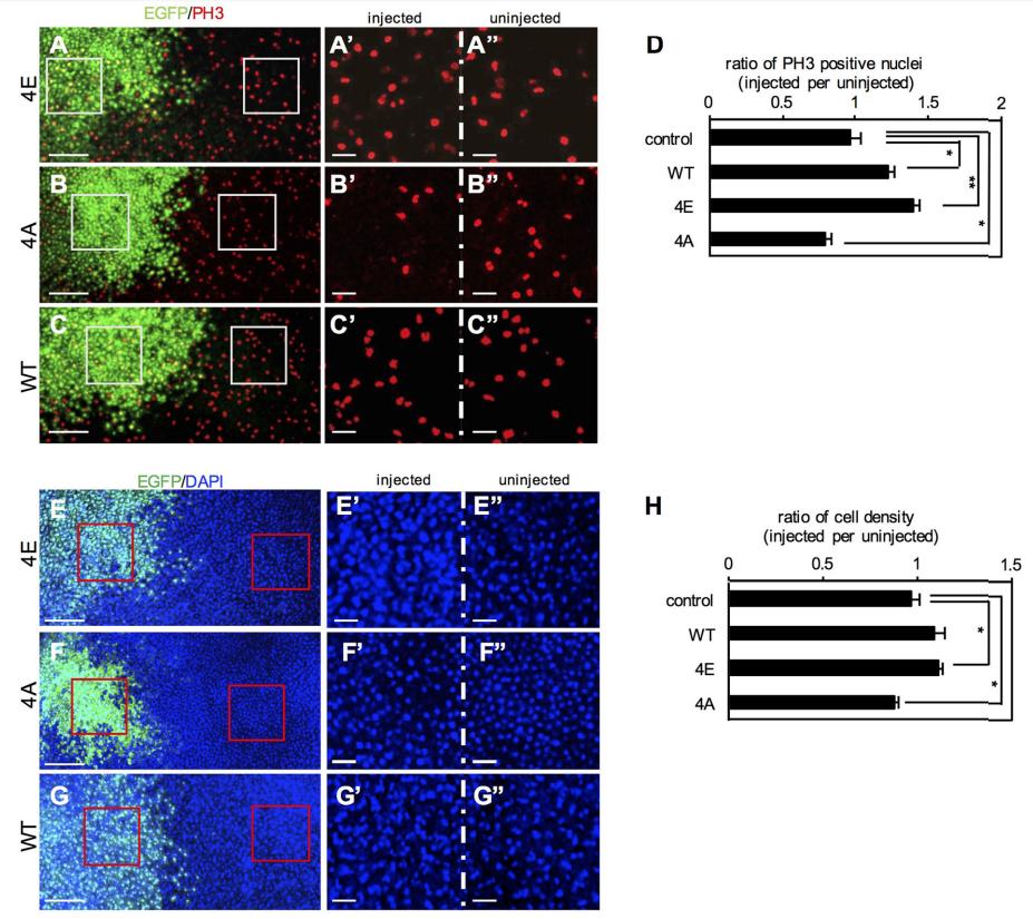 Fig. 5. Phosphomimetic Otx2-4E stimulates cell proliferation. (A-C) mRNA for Otx2-4E (A), -4A (B) or -WT (C) together with EGFP as a tracer was injected into one blastomere at the four-cell stage. Embryos were immunostained for PH3 at the late gastrula stage. PH3-positive nuclei are shown in red, Otx2 mutantexpressing cells (expressing EGFP) are shown in green. White boxes indicate enlarged areas (Aâ²-Câ²). (D) Quantitative analysis of PH3-positive nuclei. More than 90 PH3-positive nuclei were counted in one embryos, and six to ten embryos were analyzed for calculating the mean ratio (and s.e.m.) of the number of PH3-positive nuclei in injected versus uninjected areas. (E-G) Representative images of DAPI-stained nuclei in Otx2-4E (E), -4A (F) or -WT (G)-expressing gastrula embryos. Nuclei are shown in blue, and Otx2 mutant-expressing cells (expressing EGFP) are shown in green. Red boxes indicate enlarged areas (Eâ²-Gâ²). The dorsoanterior region was observed. (H) Quantitative analysis of cell numbers. More than 500 nuclei in total were counted in one embryo, and five to seven embryos were analyzed for calculating the mean ratio (and s.e.m.) of the number of nuclei in injected versus uninjected areas. **P<0.01, *P<0.05 (Studentâs t-test); error bars, s.e.m. (D,G). Scale bars: 200 μm in A-G; 50 μm in Aâ²-Gâ². |