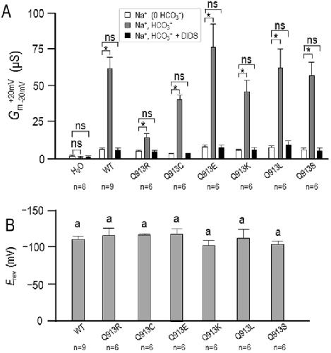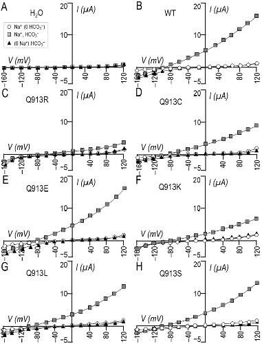 Figure 1. Effect of Na+ and HCO3− replacement on currents mediated by WT or Q913X mutants in Xenopus oocytes. (A) Representative current-voltage (I–V) relationship from a H2O-injected oocyte as it was sequentially exposed to ‘Na (0 HCO3)’, ‘Na, HCO3’, and ‘(0 Na) HCO3’ solutions. (B–H) Equivalent data from oocytes expressing WT, Q913R, Q913C, Q913E, Q913K, Q913L, or Q913S. |