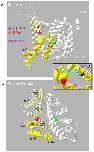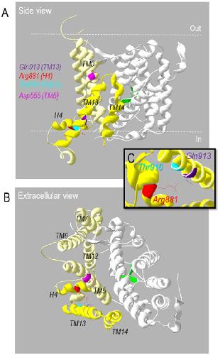 Figure 10. Homology model of the transmembrane domain of NBCe1. (A) Side view, of an NBCe1 homology model, based on the crystal structure of AE1 (PDB ID: 4YZF) showing the relative positions of the gating domain (yellow; H4, TM13, and TM14 are colored darker yellow to provide contrast), anion translocating core domain (white), putative substrate interacting domain (green), Gln913 (purple), Arg811 (red), Thr910 (cyan), and Asp555 (magenta). The gating domain is composed of six transmembrane spans (TM5-7, TM12-14) and a hydrophilic helix (H4) in the structured intracellular loop between TM12 and TM13. (B) View of the intracellular face of the same model. (C) Closer view of putative hydrogen bonds (green dotted-lines) between Arg881, Thr910, and Gln913. |