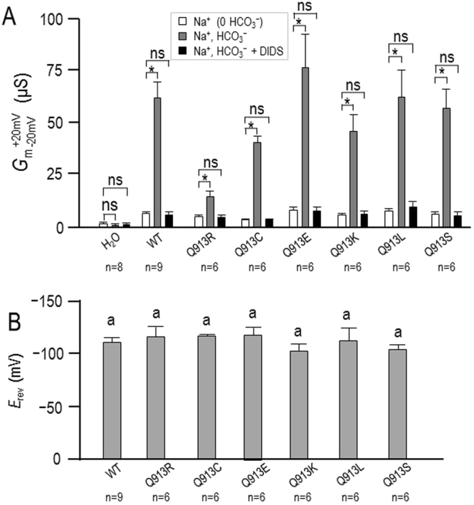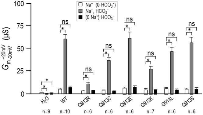 Figure 2. Membrane conductance (Gm) of oocytes expressing WT or Q913X mutants ±NaHCO3. Bar chart shows the average Gm values, measured between −20 mV and +20 mV, calculated from a larger set of I-V relationships such as those shown in Fig. 1. ‘*’denotes statistical significance between bars according to a paired one-tailed t-test (P < 0.006, accounting for Bonferroni correction for eight comparisons). ‘ns’ demotes no significance between bars by the same analysis. |