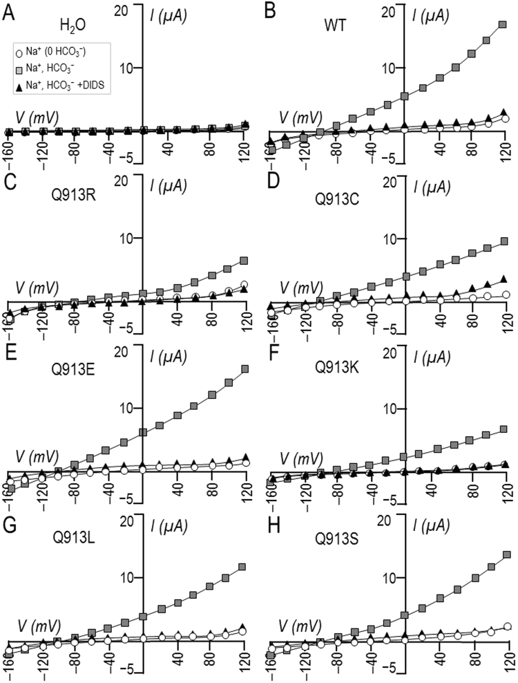 Figure 3. Effect of DIDS on currents mediated by WT or Q913X mutants in Xenopus oocytes. (A) Representative current-voltage (I–V) relationship from a H2O-injected oocyte as it was sequentially exposed to ‘Na (0 HCO3)’, ‘Na, HCO3’, and ‘Na, HCO3, +200 µM DIDS’ solutions. (B–H) Equivalent data from oocytes expressing WT, Q913R, Q913C, Q913E, Q913K, Q913L, or Q913S. |