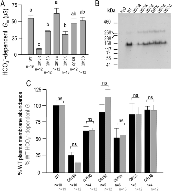 Figure 5. Functional expression of WT or Q913X mutants in Xenopus oocytes. (A) HCO3−-dependent Gm defined as Gm in ‘Na, HCO3’ solution less the Gm in ‘Na (0 HCO3)’ solution, pooled from Figs 2 and 4A. Groups that do not share the same annotated letter are deemed significantly different by ANOVA with post hoc Tukey analysis, 95% confident limit. (B) A representative anti-EGFP western blot of isolated membrane (biotinylated) fractions from Xenopus oocytes injected with H2O, or cRNA encoding WT or a Q913X mutant. (C) Bar chart of average EGFP intensity signal from western blot of biotinylated fractions of Q913X-expressing oocytes (black bars), such as that in Fig. 5B, normalized to the signal from WT-expressing oocytes from each blot. Data are plotted alongside a similarly normalized version of the data presented in Fig. 5A (gray bars). ‘ns’ denotes no significance between bars (P > 0.007, accounting for Bonferroni correction for seven comparisons). |